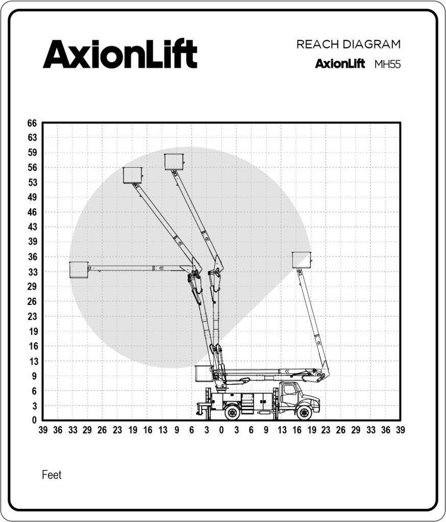 MH55 MH55 Articulating Aerial Lift Power and performance at height. The MH55 offers a remarkable 60.4 ft working height and 36.1 ft of horizontal reach, combining robust engineering with precision controls for optimal performance in the most challenging environments. Download Brochure Get a Quote 60.4 ft Working Height 36.1 ft Maximum Side Reach 12.6 ft Stowed Travel Height Reach Diagram General Specification Ground to bottom of the platform 55.5 ft Working height 60.4 ft Maximum side reach 36.1 ft Stowed travel height 12.6 ft Platform capacity 700 lb Platform dimensions 24 x 24 x 42 in Lower boom articulation -2º to 102º Upper boom articulation 0º to 155º Rotation 360º continuous infinite